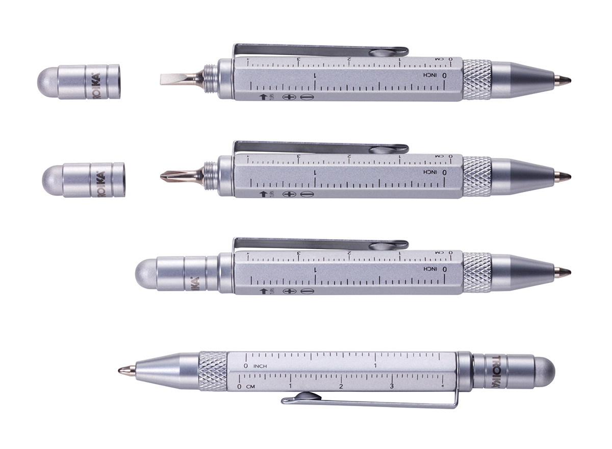 • wielofunkcyjny: linijka w centymetrach i calach, śrubokręt płaski i krzyżakowy, rysik do ekranów dotykowych, wkład w kolorze czarnym + 2 zapasowe wkłady