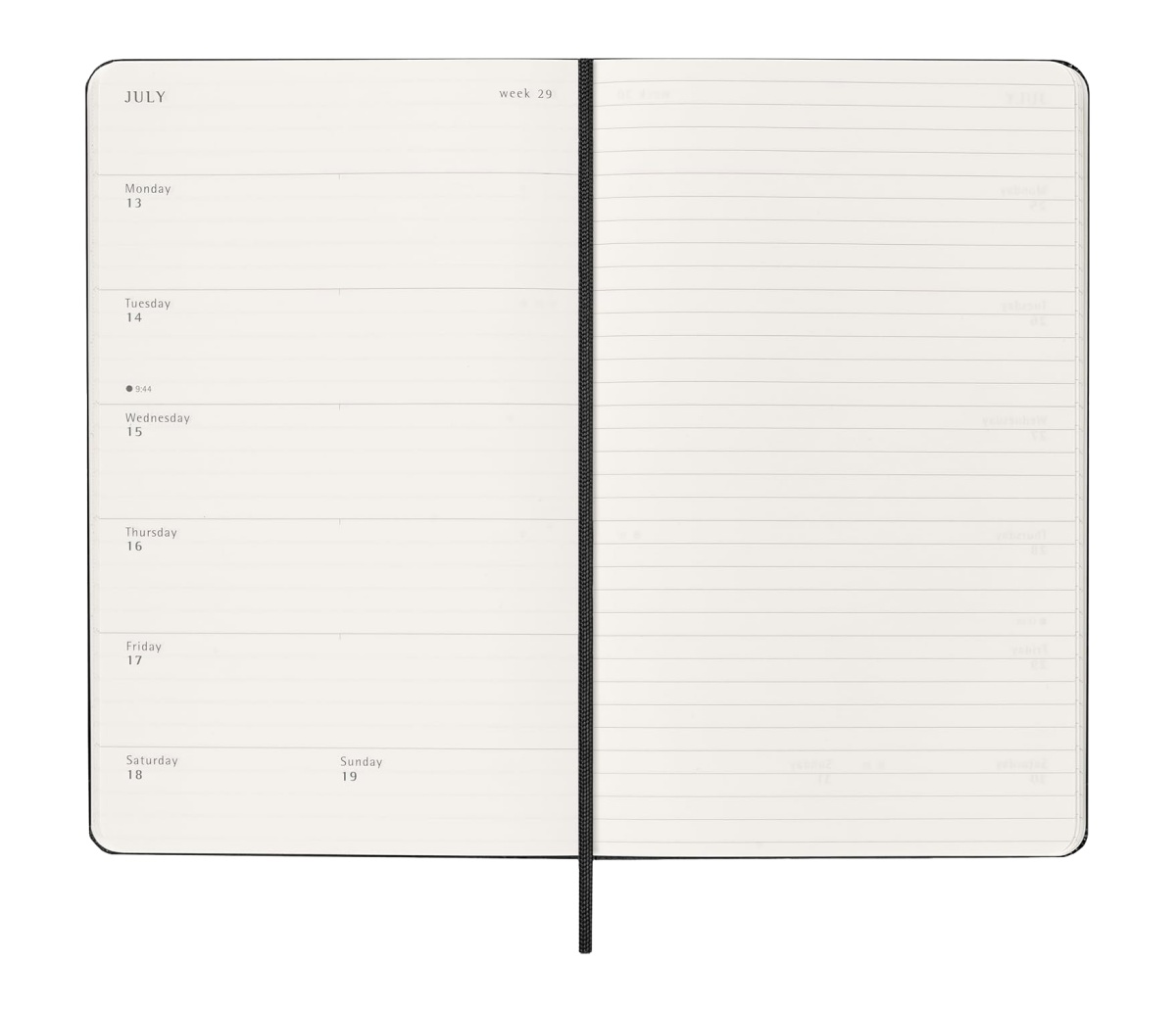 - formatted with weekly appointments on the left and a ruled page for notes and ideas on the right
