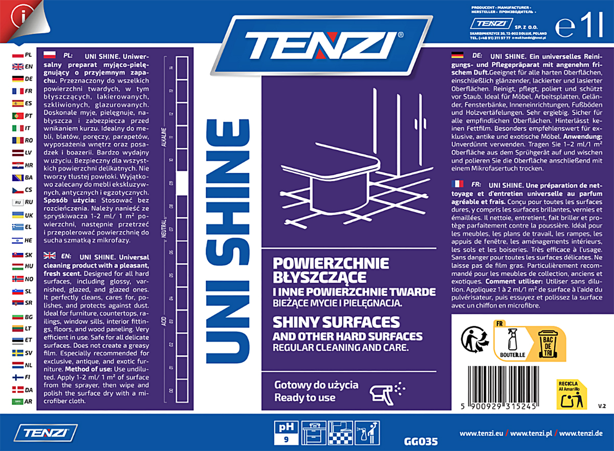 Nazwa produktuPreparat myjąco-pielęgnujący do mebli i powierzchni błyszczących TENZI, Uni Shine, 1l