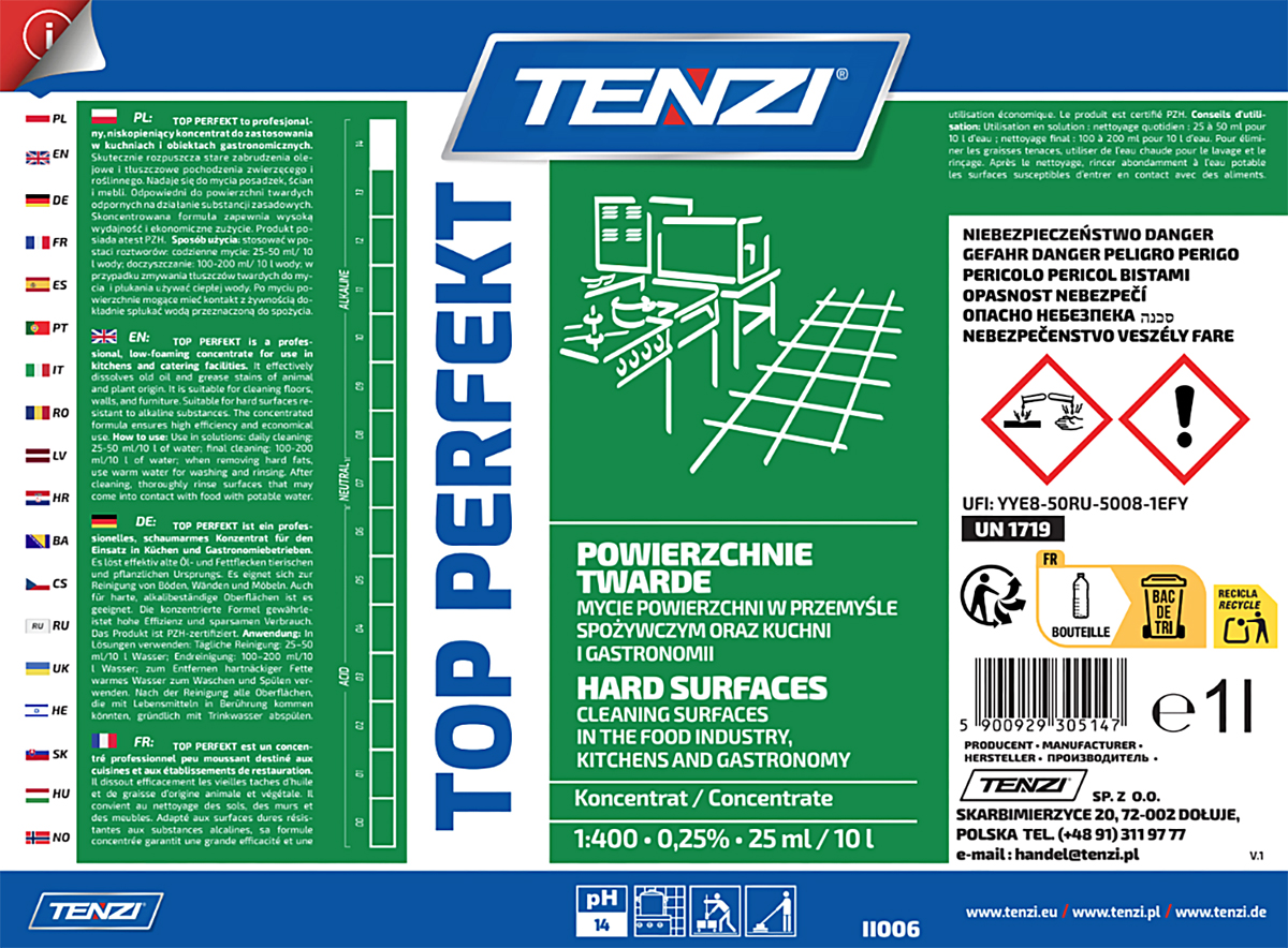 Nazwa produktuŚrodek odtłuszczająco-myjący do powierzchni twardych TENZI, Top Perfekt, atest PZH, 1l
