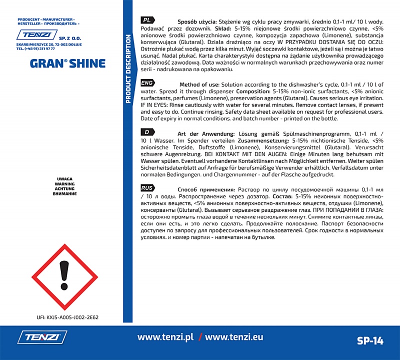 Nazwa produktuKoncentrat do nabłyszczania naczyń w zmywarkach TENZI, Gran Shine, 10l