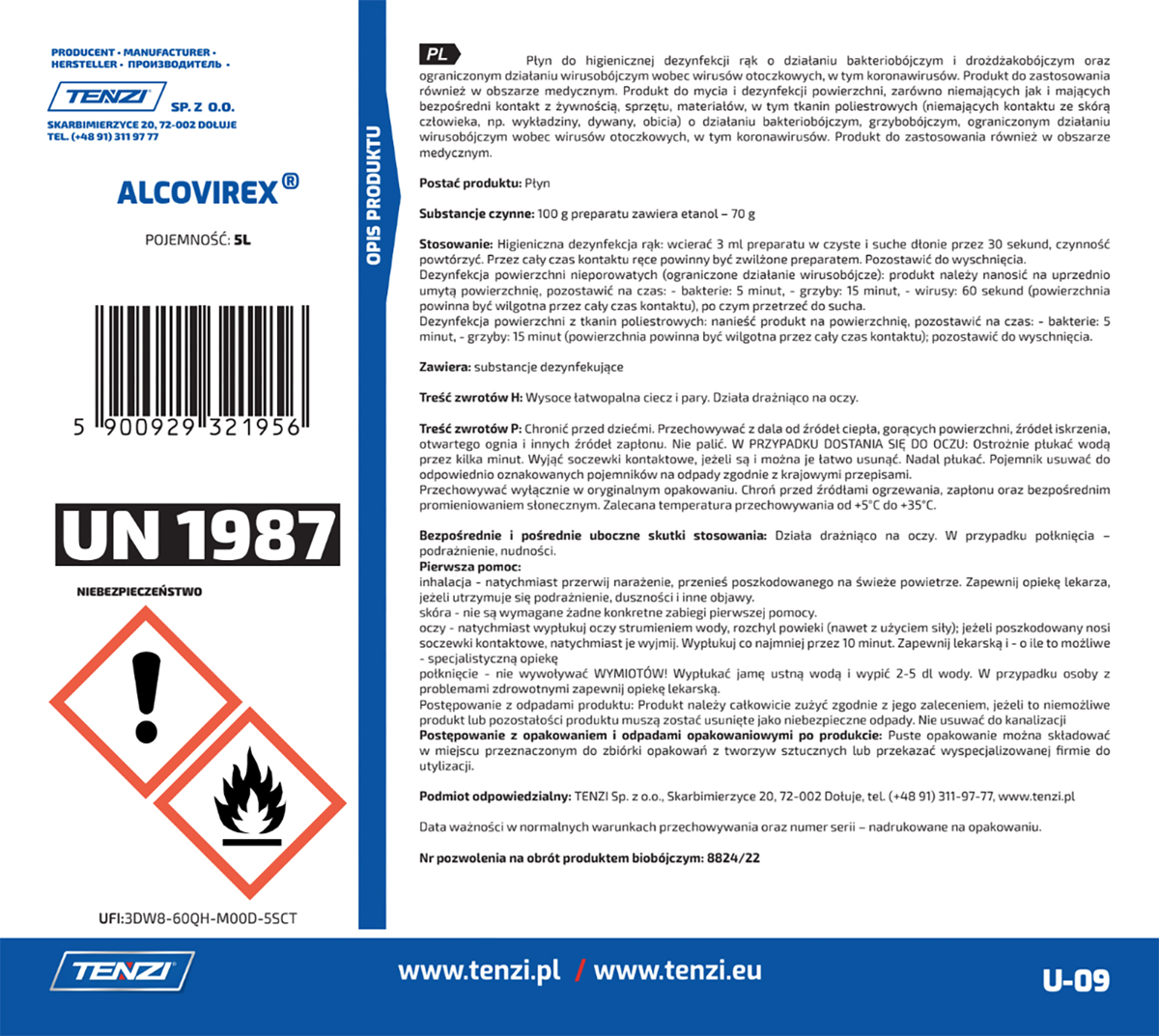Nazwa produktuPłyn do dezynfekcji rąk, narzędzi, powierzchni TENZI, Alcovirex, 5l